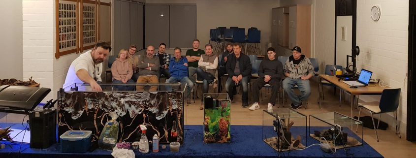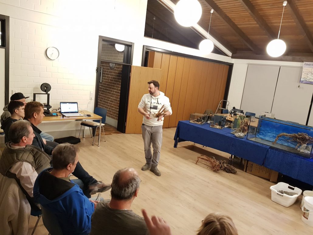Unser erster Vorsitzender Benjamin B. führte kompetent durch den Abend und erläuterte anschaulich verschiedene Einrichtungsmodelle, darunter auch verschiedene Zucht- oder Artenbecken und Beleuchtungsvarianten. Darüber hinaus gab er wertvolle praktische Hilfestellungen rund um die Aquaristik und stand für Fragen jederzeit zur Verfügung. Auch der, von unserem Mitglied Malte mitgbrachte 3D-Drucker, brachte einen tollen Einblick in die Möglichkeit, sich viele praktische Utensilien wie Garnelenröhren einfach selbst zu drucken.